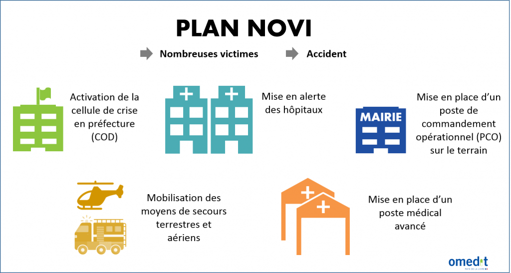 Plan ORSEC-NOVI (Organisation de la Réponse Sécurité Civile – NOmbreuses VIctimes) C’est un plan d’urgence mis en place pour répondre à une situation de crise pré-hospitalière. Mobilise l’ensemble des acteurs de la chaîne de secours pour porter assistance à un nombre important de victimes dans un même lieu (ex : attentat, accident de car, etc.) ou une même zone géographique.