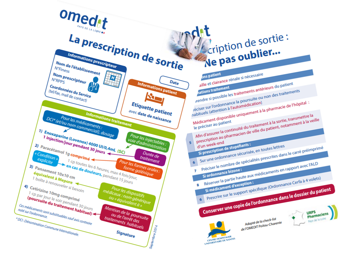 Adaptée de la checklist réalisée par l’OMEDIT Poitou-Charentes, elle contient les informations à faire figurer sur une prescription établie à la sortie du patient et nécessaires à la :